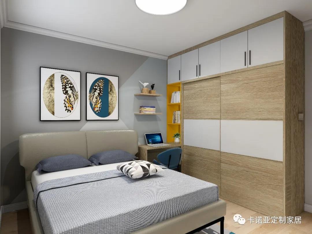 衣柜與書桌、書柜一體化,為孩子騰出更多自由活動(dòng)的空間,既滿足了小孩的學(xué)習(xí)效率、收納需求,又讓原本狹長的兒童房更顯整齊、開闊、明亮。