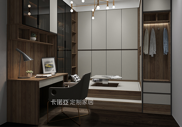 客臥榻榻米設(shè)計(jì)感獨(dú)特,大面積運(yùn)用白色,會(huì)讓整個(gè)空間看上去明亮很多,地板是木色的瓷磚鋪貼,梯柜設(shè)計(jì)增加儲(chǔ)物空間,書房+衣柜+臥房+待客室,一室多用,功能滿分。