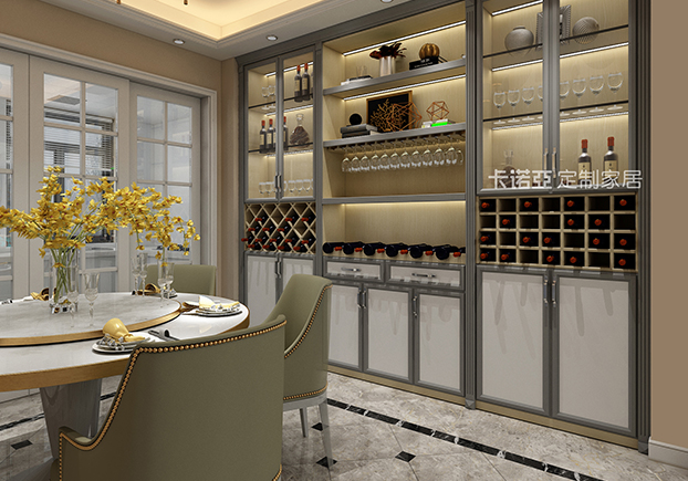 餐廳則選用了歐式風(fēng)格明顯的餐椅及現(xiàn)代風(fēng)格明顯的餐桌,在復(fù)雜與簡(jiǎn)約上取得了微妙的平衡。背景墻則做了整面的餐邊柜,用于放置多余的餐具廚具、干貨雜貨、酒杯、飾品等,為廚房空間收納減壓。