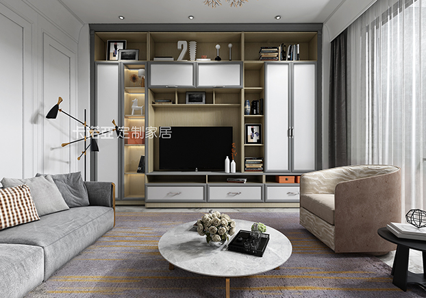 客廳的色調(diào)以白色為主,灰色、深木色作為點(diǎn)綴,各種顏色在明暗上形成對(duì)比,使空間不會(huì)過(guò)于蒼白。
