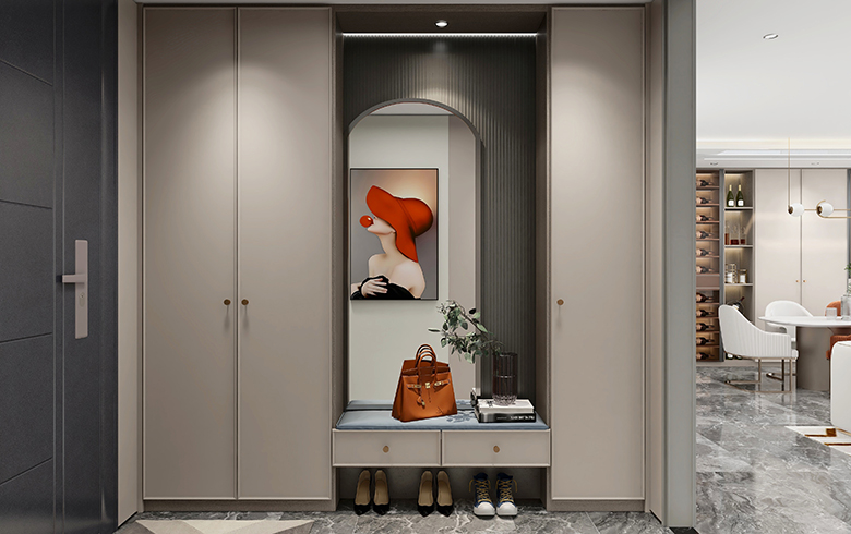 玄關(guān)柜采用“慕尼黑”與“優(yōu)雅暖灰”的撞色搭配,賦予門廳更多的色彩層次。中間凹位設(shè)計(jì),上凹位留出展示窗,放置包包、鑰匙、帽子、綠植、飾品等,放上試衣鏡,整理儀容亦可放大空間;下凹位放常用鞋子?!澳侥岷凇备駯疟尘鞍?,成為門廳吸睛點(diǎn)。