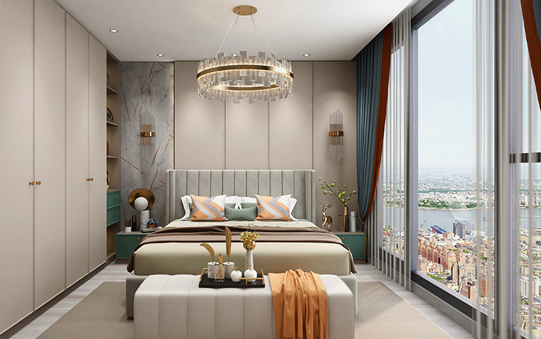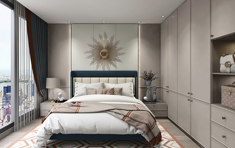 臥房大量應(yīng)用淺色調(diào)“流光漫步、優(yōu)雅暖灰”,安定情緒,助力睡眠。床頭背景墻使用護(hù)墻板,隔音降噪,柔軟的絲絨床頭可以靠著看書,適合睡前閱讀。床頭柜加入跳躍的“電光墨綠”,讓臥室洋溢大自然氣息。床側(cè)定制靠墻衣柜,一側(cè)做成半開放式,更適合放置睡前常用物品。