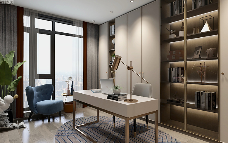 靠墻定制書柜,柜門、柜體采用“優(yōu)雅暖灰、流光漫步”的搭配,讓書房氣質(zhì)超然。開放加封閉結(jié)合,讓空間有了呼吸感,工作身心更愉悅。玻璃柜門方便打理也同時(shí)擁有展示功能,落地窗邊放置一張沙發(fā)和邊幾,營造慵懶氛圍,累了可以在此品茗休憩。