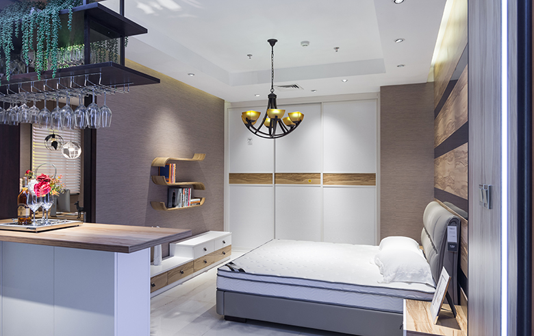 大面積運用橄欖木+高原雪橡/印象白的撞色搭配,給人明朗、活潑、自然之感。150°弧形板展示架,帶給空間更多美妙的曲線。