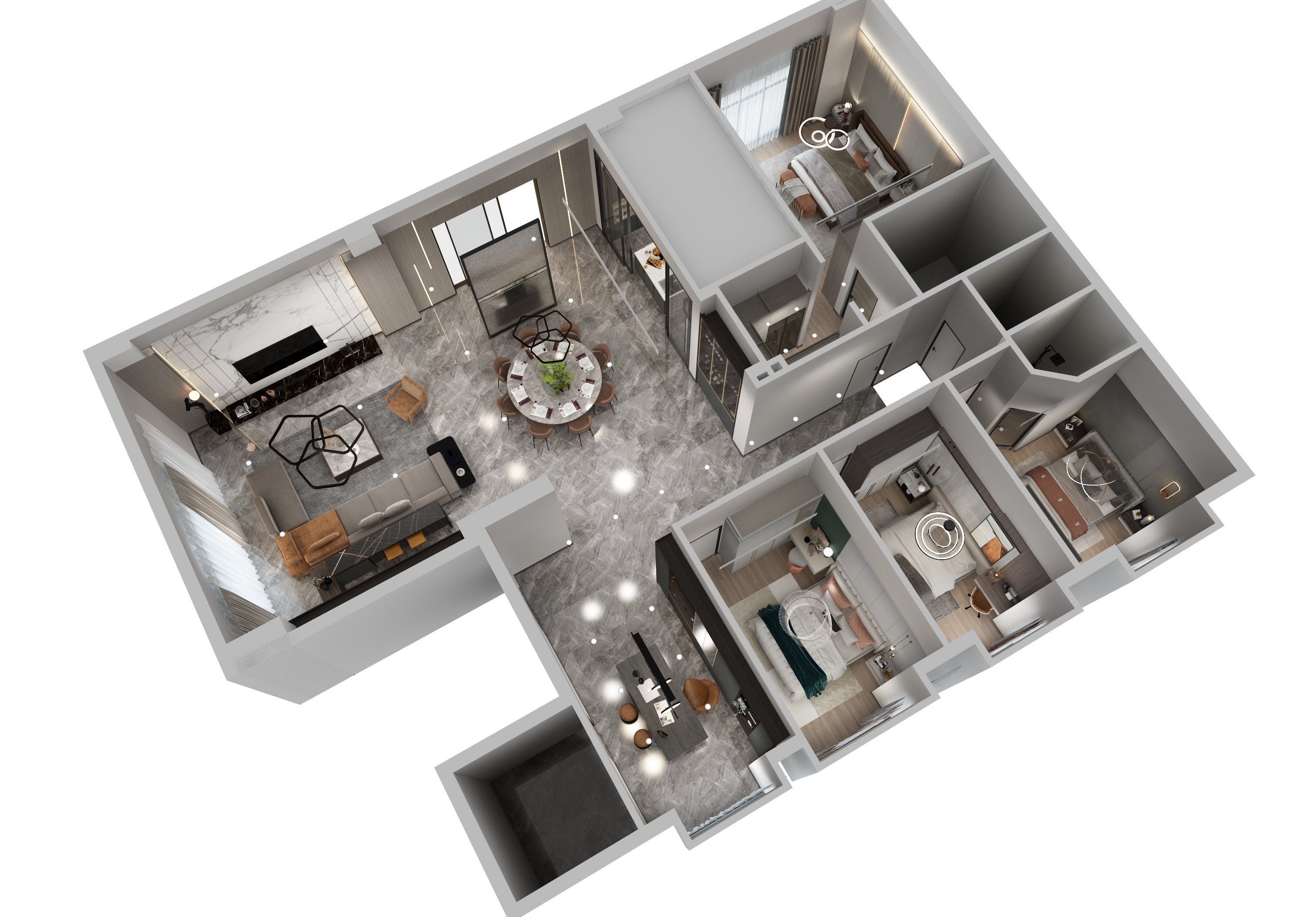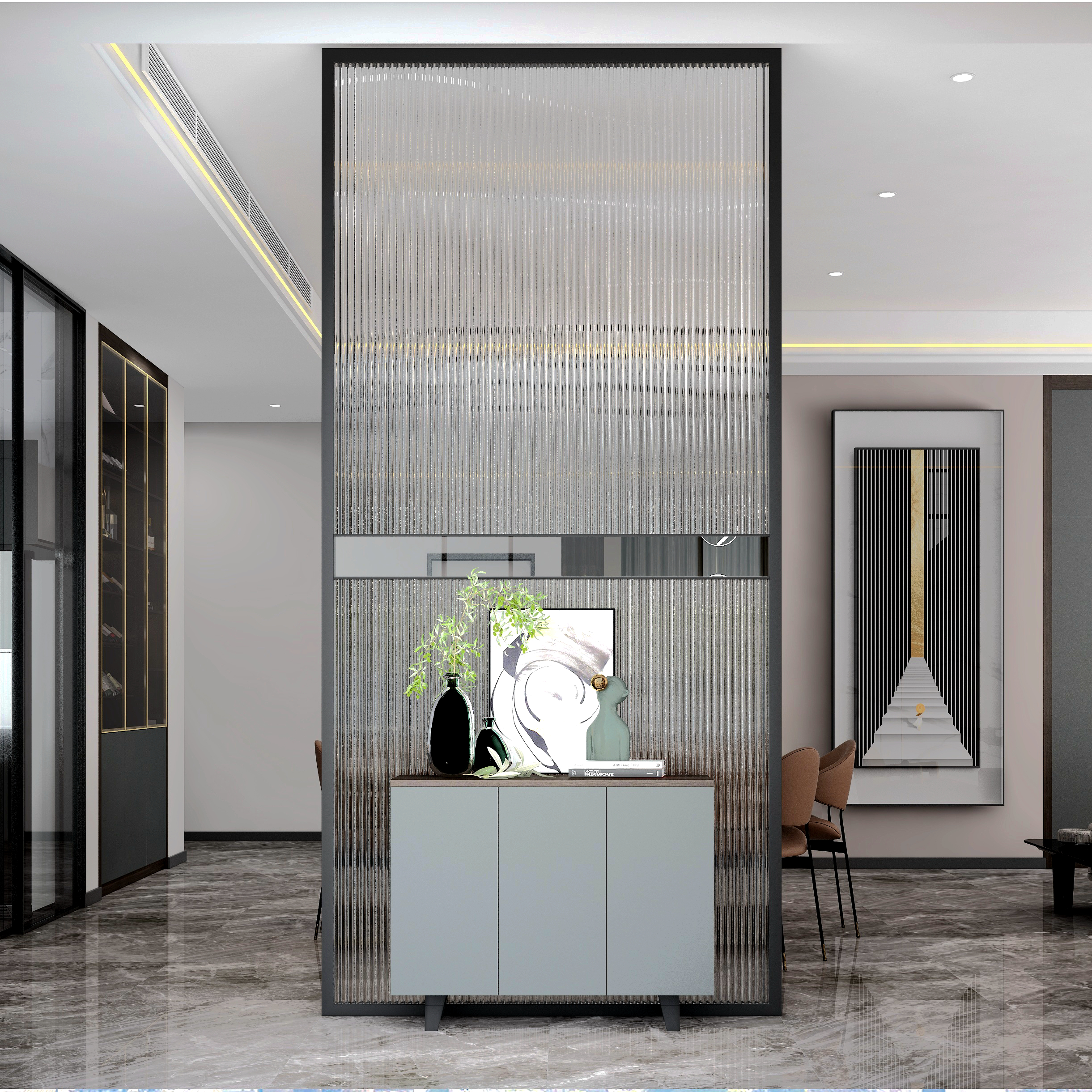 在接近夜幕時刻的傍晚,天空還帶著微微的晚霞,天空是霧蒙蒙的,泛著暖暖的光,暮色刻畫出來的棱角,不像深夜那么模糊,不像白天那么清晰,有一份恰好的柔和感又有一份溫柔的醉意。而我門這次方案的構(gòu)思,將設(shè)計方案定義為極簡風(fēng)格,保留著黑白灰本有的色塊分明度,在色彩元素上增加了一些暖色調(diào),在材質(zhì)提現(xiàn)上摻入一些絲絨磨砂柔軟觸感的質(zhì)感搭配,緩和黑白灰的線條感,讓冷峻的空間感多一點生活的煙火氣息