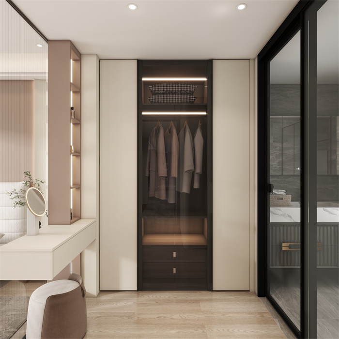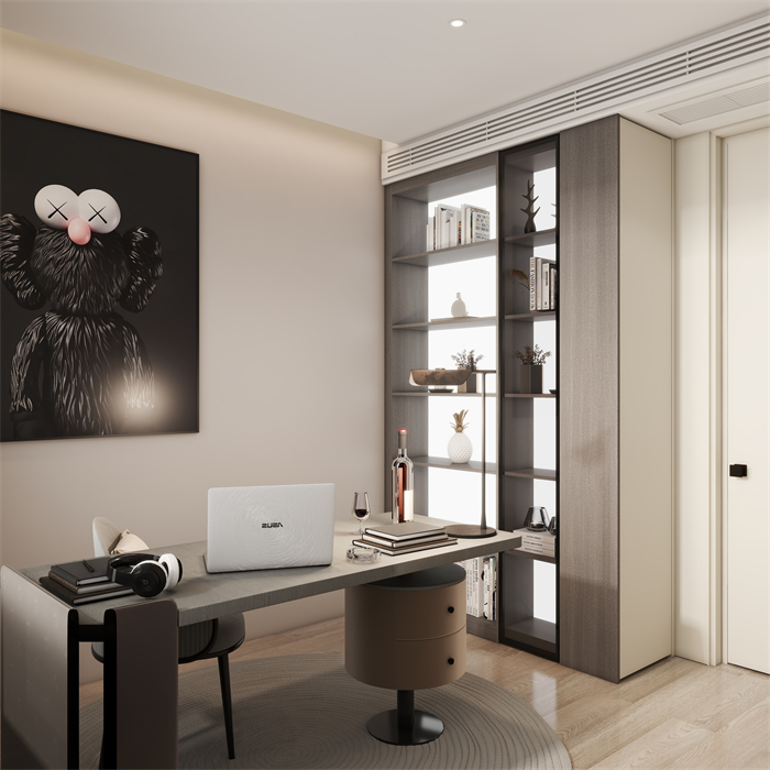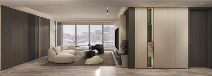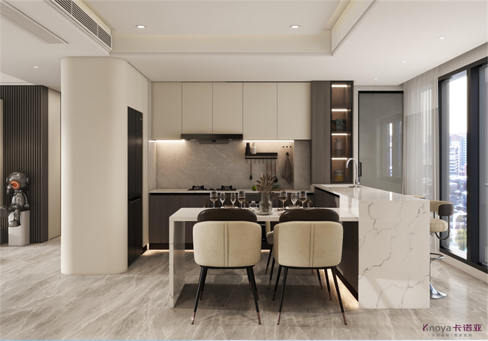 這是一個三口之家,客戶是都市精英人才,對生活充滿了熱愛,對品質(zhì)有著極高的要求,所以本方案主要以高級灰木紋色為主,搭配溫柔典雅的水性漆雅杏,給客戶營造一個親近自然,同時又不失奢華的溫馨舒適的空間。廚房在原有的空間上做了一個大膽的改造,打造了一個中西結(jié)合的開放式廚房,空間更大,功能更齊全。同時一些墻角和柜體也做了圓弧設(shè)計,動線更加流暢的同時,更顯時尚和高級。