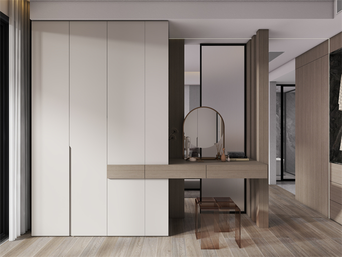 家具選擇上,以簡約現(xiàn)代風格的家具為主,注重舒適度和功能性。軟裝細節(jié)上,采用柔和的色彩和材質。廚房注重實用性和便利性,采用嵌入式收納設計,最大化利用空間,營造一個干凈整潔的烹飪區(qū)域。臥室以舒適為設計重點,采用柔和的色調和舒適的床品,營造令人放松的休息空間。充分利用儲物空間保持整潔有序。