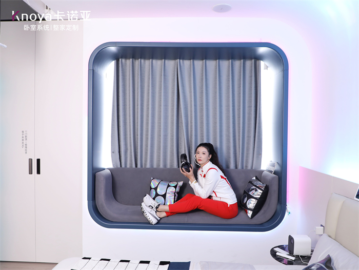 進(jìn)入“樂(lè)在臥室”系列產(chǎn)品時(shí),陳曉君禁不住坐在了卡諾亞專為活力青年設(shè)計(jì)的太空艙飄窗上,打開(kāi)繽紛極光燈時(shí),整個(gè)空間充滿了未來(lái)的科幻感,仿佛置身極地的星空下,美輪美奐,讓人充滿遐想。針對(duì)年輕人喜愛(ài)的潮流手辦,專門(mén)打造的展示柜,讓心愛(ài)的“它”有了歸屬??吹娇缮惦姼?jìng)桌,我們的體育明星也童心未泯,忍不住坐到電競(jìng)椅上,敲打鍵盤(pán),點(diǎn)擊鼠標(biāo),準(zhǔn)備開(kāi)黑呢!更讓陳曉君驚奇的是,這里還有一個(gè)隱藏式投影屏幕,躺在床上就可以看電影、看動(dòng)漫,搭配床頭投影出水波紋的藍(lán)光,在場(chǎng)的人都沉浸在對(duì)浩瀚星際的幻想中。