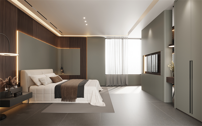 【睡眠區(qū)】床頭護(hù)墻板,一前一后采用溫暖的深木色搭配溫婉的“薄暮灰”,護(hù)墻板轉(zhuǎn)角采用圓弧過(guò)渡,優(yōu)雅流暢的曲線輪廓,彰顯空間的圓潤(rùn)感、高級(jí)感和立體感。柔軟舒適的寢具,讓每個(gè)追夢(mèng)人沉浸美夢(mèng)之中。