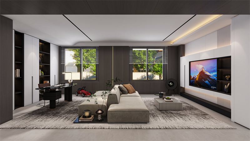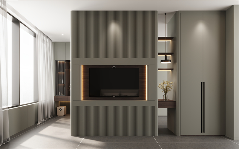 電視背景墻采用簡(jiǎn)潔流暢的線條,與簡(jiǎn)約的“晨露白”色彩完美融合,弧形轉(zhuǎn)角過(guò)渡,展現(xiàn)一種簡(jiǎn)約而不失精致的柔美感。電視柜采用高端定制精湛工藝,包括黑科技的懸浮設(shè)計(jì)+柜中柜設(shè)計(jì)+拉米諾/無(wú)孔工藝,打破傳統(tǒng)墻面的厚重感,賦予空間輕盈靈動(dòng)的觀感。