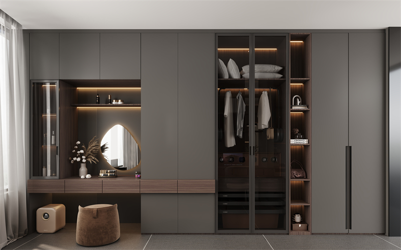 【收納區(qū)】臥室收納區(qū)設(shè)置成一個(gè)步入式衣帽間,靠墻定制一整排衣柜+梳妝臺(tái),讓每一次的換裝都賞心悅目,為白領(lǐng)精英的美好形象加分,打造高顏值的精致生活。