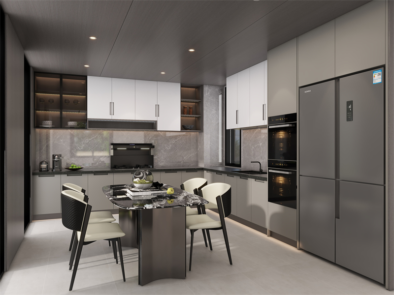 餐廚一體化設(shè)計(jì),破除空間壁壘,打造通透自由家。L型廚房布局,科學(xué)分區(qū),下廚井然有序。柜電一體化設(shè)計(jì)視覺(jué)統(tǒng)一協(xié)調(diào),還能充分釋放儲(chǔ)物空間。針對(duì)廚房潮濕高溫的特殊環(huán)境,櫥柜采用22mm靜電噴粉門(mén)板定制柜,360°環(huán)繞防潮覆蓋,耐黃不變色,樹(shù)脂粉末高溫固化,色彩更耐看,打造簡(jiǎn)約高級(jí)的廚房。