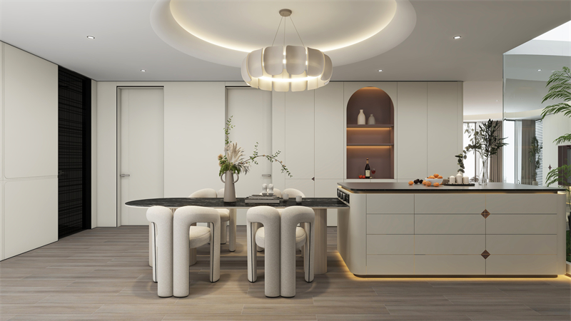 開放式餐廳布局,島臺(tái)+餐桌一體化設(shè)計(jì),富有造型的餐椅搭配,中和了空間的單一感。簡約清爽的“白芷”配色,隨處可見的三角幾何門型點(diǎn)綴,賦予用餐時(shí)光,更多有趣的生活情調(diào),讓家人縱享美味佳肴。
