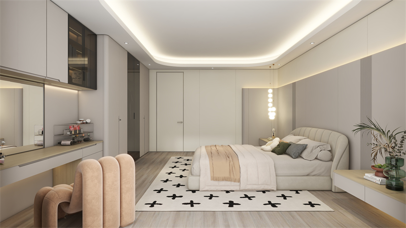打破傳統(tǒng)墻面直線條的常規(guī)設(shè)計(jì),圓弧護(hù)墻板以更柔和的曲線語言,勾勒臥室的柔美與靜謐,搭配奶油色系軟裝,簡單耐看,營造深度睡眠的舒適環(huán)境。