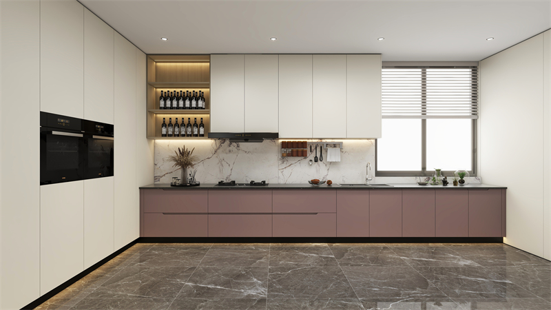 針對(duì)廚房潮濕高溫的特殊環(huán)境,櫥柜采用噴粉定制柜,360°環(huán)繞防潮覆蓋,耐黃不變色,樹脂粉末高溫固化,色彩更耐看,打造高級(jí)溫柔的廚房。“藕粉”與“白芷”搭配,溫暖柔和的色調(diào),清新唯美的廚房空間,實(shí)現(xiàn)功能和美觀的統(tǒng)一,讓下廚時(shí)光變得優(yōu)雅從容。