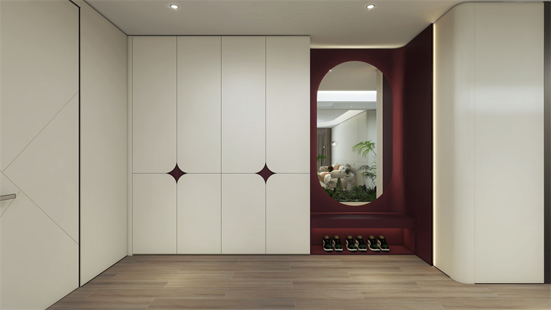 圓弧形的轉(zhuǎn)折處理,使得玄關(guān)區(qū)域在視覺上更加流暢與連貫,宛如自然延伸出的一個(gè)優(yōu)雅弧度,引領(lǐng)家人順暢步入家中。下方保留開放式常換鞋區(qū),簡潔實(shí)用;圓弧拼接門型搭配“白芷”、“紅鸞”撞色點(diǎn)綴,打破傳統(tǒng)色彩界限,賦予空間柔和而深邃的視覺層次。