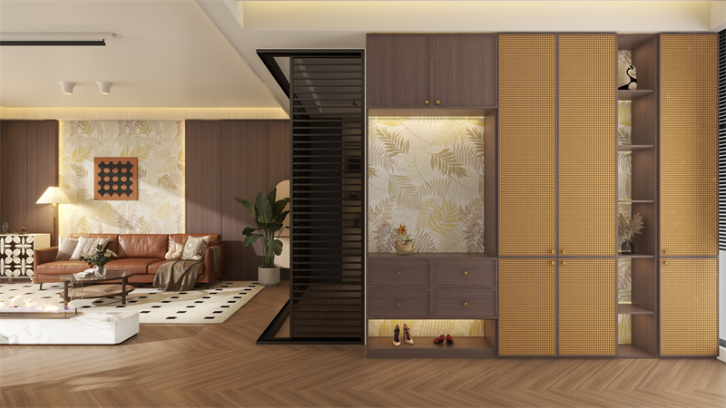微醺濾鏡下的中古風(fēng),從入戶起就開始鋪墊復(fù)古的基調(diào)。胡桃木紋理搭配咖啡色藤編,讓古樸的氣息從玄關(guān)開始,彌漫家中每個(gè)角落,以復(fù)古高級(jí)的腔調(diào)為畫筆,勾勒出自帶電影氛圍感的空間,打造富有享受的視覺空間。