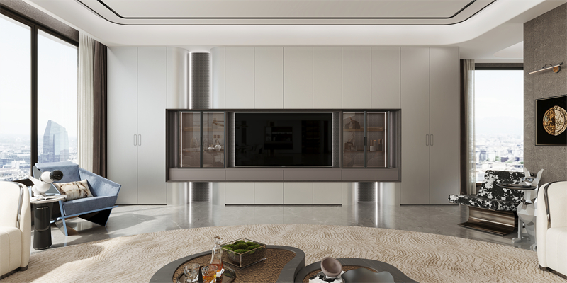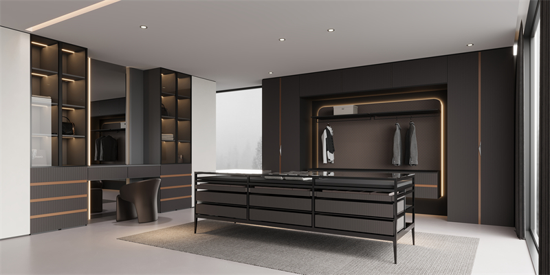 ·材質(zhì)對話:直紋肌理板材與澀黑柜體形成深淺對比,數(shù)碼打印出來的紋理如大理石般通透,鋁木玻璃柜將金屬堅韌與木材溫潤完美結(jié)合。
