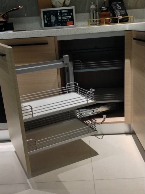 裝修過的業(yè)主表示,選部分柜子改成拉籃非常有必要,尤其有助于增加廚房收納。比如灶臺下改成碗碟拉籃,吊柜中加裝下拉拉籃,櫥柜轉角處裝怪物拉籃等,都是非常劃算的一筆投入。