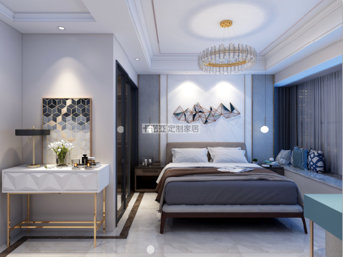 主臥有一面超大的落地飄窗,陽光灑到床上時,就是幸福感洋溢的一刻。房間里有梁柱和角落,定制一個藝術(shù)裝飾柜,擺放一張藝術(shù)裝飾畫和綠植,裝飾柜大小與梁柱正合適,讓角落也成為一道靚麗的風(fēng)景線。