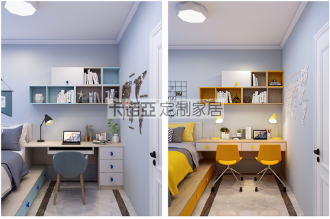 到頂衣柜設(shè)計,滿足孩子日常衣物的收納。男孩房海天藍+印象白+淺色木紋、女孩房活力橙+印象白+淺色木紋的活力色調(diào)的組合,與房間整體配色相契合。衣柜門側(cè)面的開放格,用來展示玩具、孩子所獲得的獎杯及獎狀,以及記錄成長的相冊。