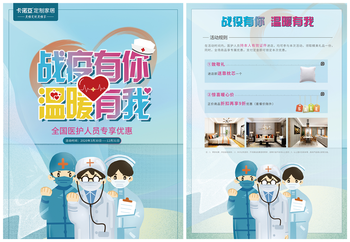 戰(zhàn)疫在前線的醫(yī)務人員,他們用大愛護大家,而卡諾亞作為定制家居行業(yè)的領軍者之一,疫情當前身體力行地承擔起企業(yè)的社會責任,積極傳遞正能量,發(fā)揮自身的光和熱,為愛放價,以自己的綿薄之力回饋他們,呵護他們的愛家,做逆行者堅強的后盾。