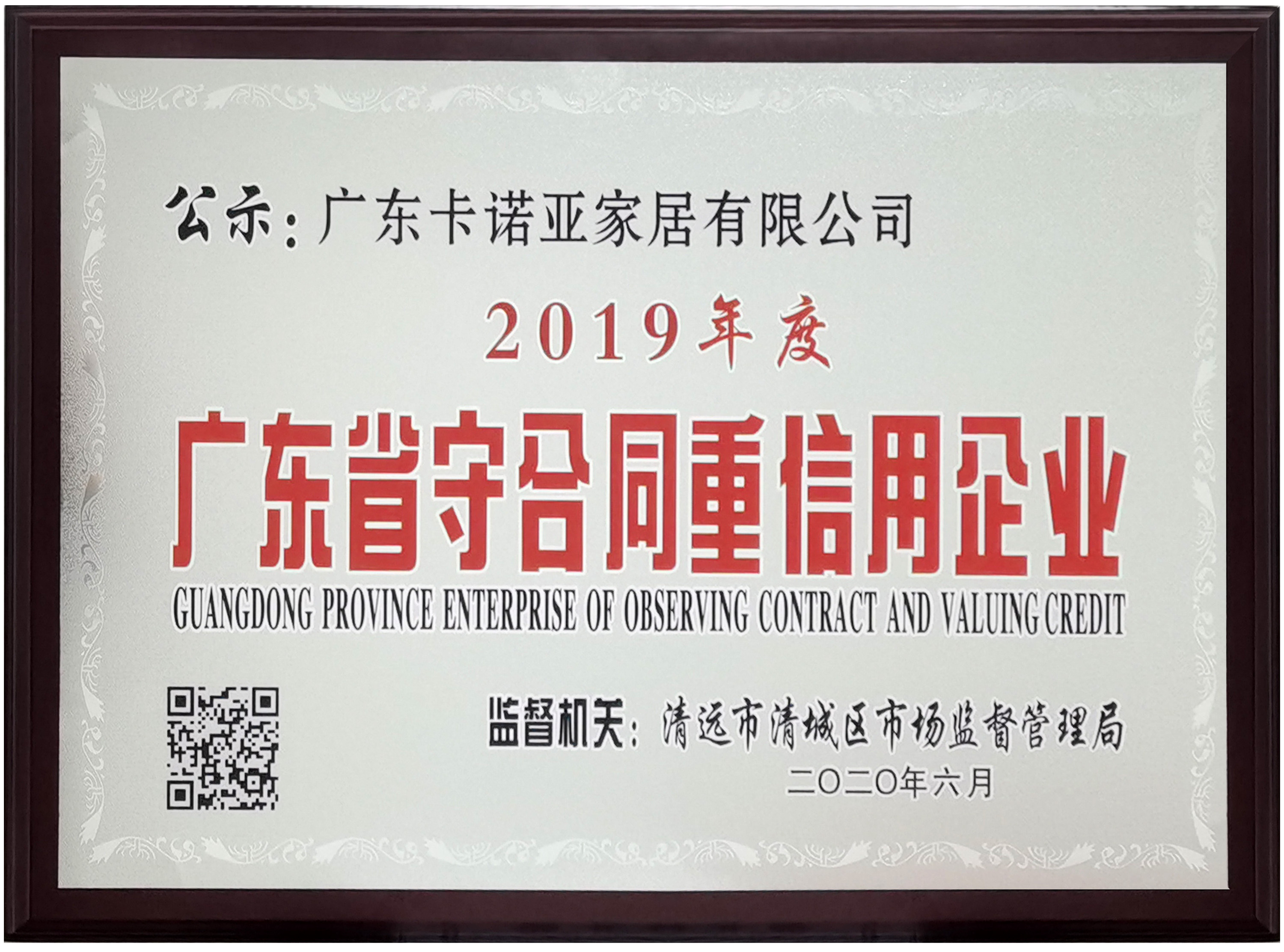 近日,廣東省清遠市清城區(qū)市場監(jiān)督管理局對廣東省守合同重信用企業(yè)進行公示,廣東卡諾亞家居有限公司憑借良好的信譽與契約精神,依靠19年來的誠信經(jīng)營與優(yōu)質(zhì)服務(wù),順利通過最終評審,獲得“2019年度廣東省守合同重信用企業(yè)”殊榮,這是對公司誠信管理的高度肯定和誠信服務(wù)的極大鼓勵。