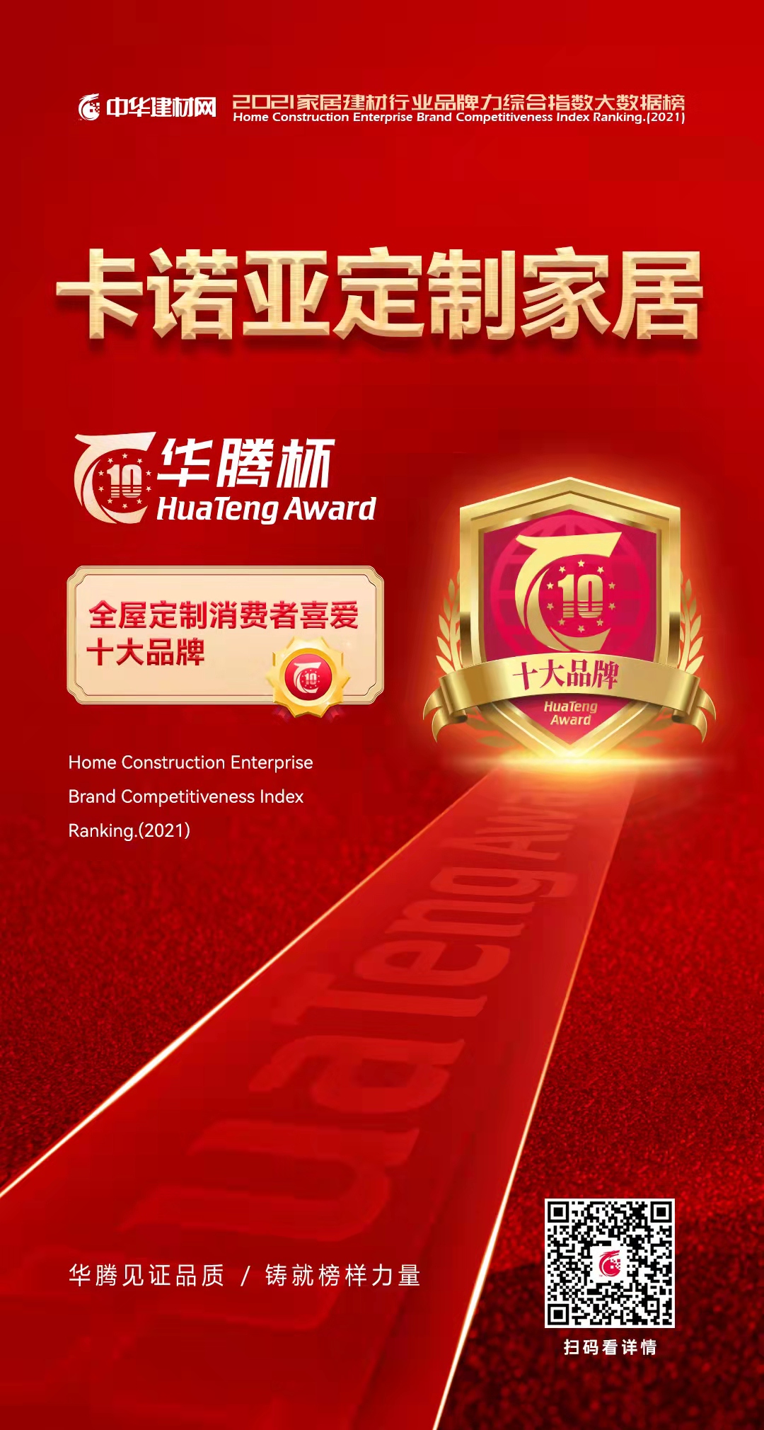 9月1日,由中華建材網(wǎng)主辦的“華騰杯·2021家居建材行業(yè)品牌力綜合指數(shù)大數(shù)據(jù)榜”重磅揭曉,卡諾亞定制家居憑借品牌綜合實力,榮獲“全屋定制消費者喜愛十大品牌”,彰顯公司在產(chǎn)品、設(shè)計及服務(wù)層面滿足新消費升級需求,助力中國消費者對高品質(zhì)家居和幸福生活的追求。